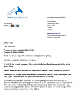 In 2010, the council awarded a 25-year contract worth £250m to Balfour Beatty to upgrade all the city’s street lights. This was completed within the first 5 years costing around £55m.